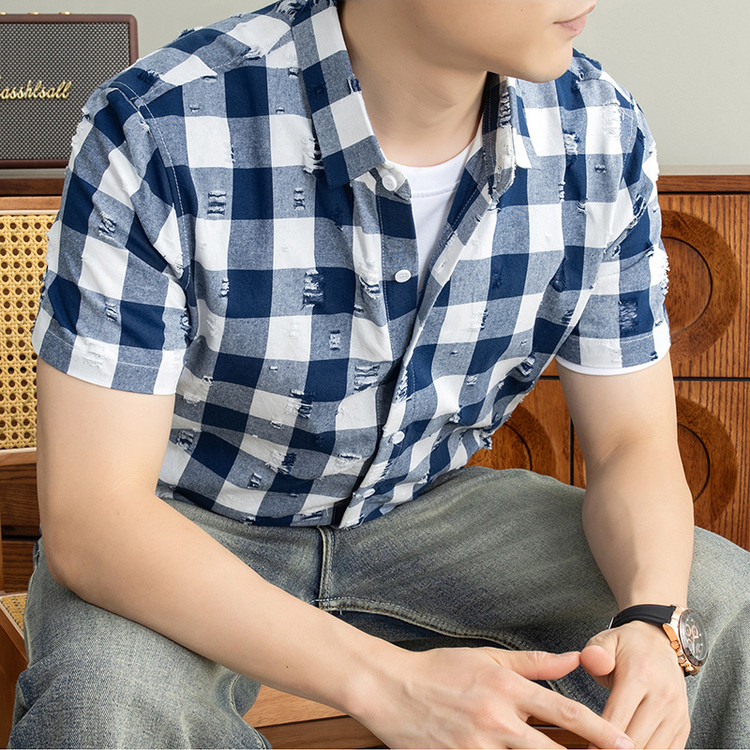 辰野电商&1027数据爆款格子数码印花无痕短袖衬衫